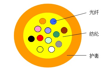 室內多芯微型光纜使用多根著色光纖作為光傳輸介質,外覆一層芳綸作為受力加強單元,最外擠制一層扁平聚氯乙烯(PVC)或低煙無鹵材料(LSZH,低煙、無鹵、阻燃)護套而成。