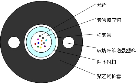 GYFXY光纜的結構是將250µm光纖套入高模量材料制成的松套管中,松套管內填充防水化合物。松套管外加阻水材料以保證光纜縱向阻水,兩側放置兩根平行玻璃纖維增強塑料(FRP)后擠制聚乙烯護套成纜。